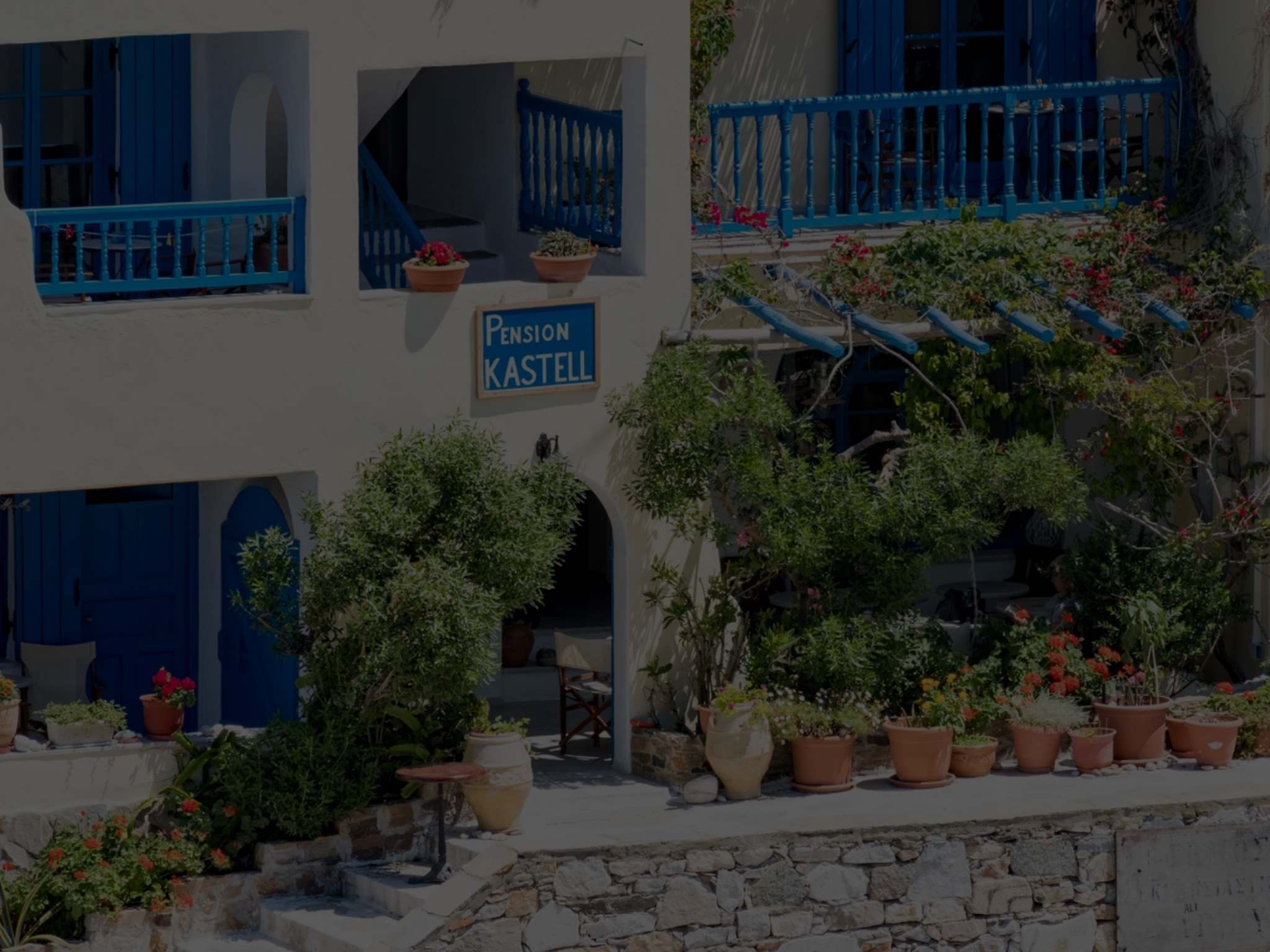 Die kleine Pension Kastell liegt auf der Rückseite des hoch über Naxos-Stadt aufragenden Kastells. Fernab von sämtlichen Hauptverkehrsstraßen sind die Gassen der Altstadt und die Hafenpromenade schnell zu erreichen. Die Pension bietet Doppel- und Dreierzimmer sowie Studios mit kleiner Küche. Alle Zimmer haben einen Balkon und ein eigenes Bad. Die Terrasse und der Dachgarten laden zum Sonnen, Grillen & Verweilen ein. Nikos Katsaras und seine deutsche Frau Nicole leiten die Pension in herzlicher und familiärer Atmosphäre. Bei allen Fragen und Problemen stehen sie gerne zur Verfügung.